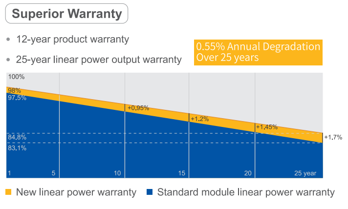 - odolnosť proti poveternostným vplyvom: panely majú certifikáciu pre zaťaženie snehom (5 400 Pa) a vetrom (2 400 Pa)